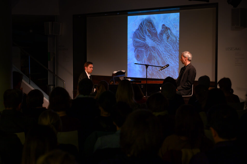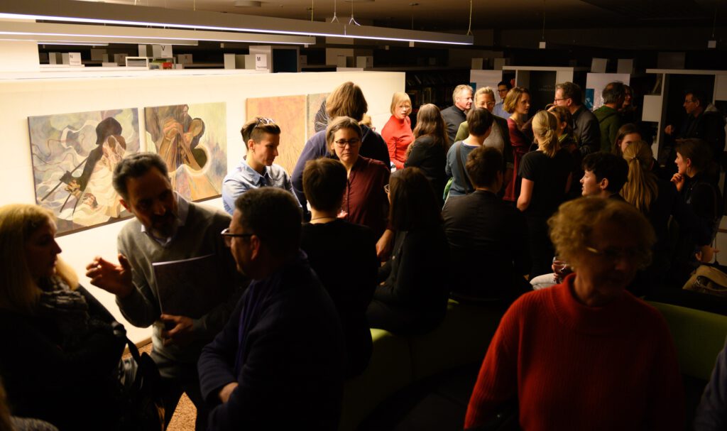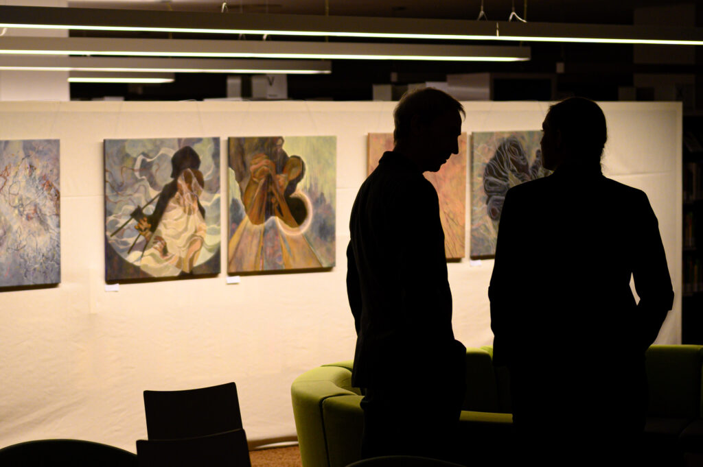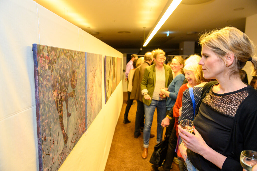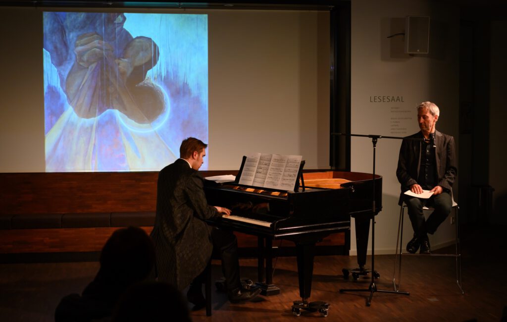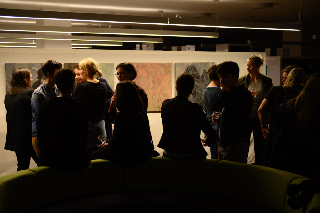 „Das Marsyasprojekt“ (The Marsyasproject) was an arty collaboration on the myth of Marsyas in six pieces arranged as poems by Flora von Herwarth, piano suites by Alexander Kokic Schmidt and paintings by Sandy Lang. Deviding the myth in six pieces followed the fate of Marsyas after finding the flute and challenging the God Apollo in a musical competition which leads to Marsyas being flayed and becoming a river. The collaboration emphasized on the idea of symbiosis and metamorphosis as consequence of being an artist. The project was displayed in a soireé of exhibition, concert and reading in January 2020. The poems were recited by Armin Nufer. Full display of all six paintings here. Mauritius-Mediathek Wiesbaden, January 18th 2020.