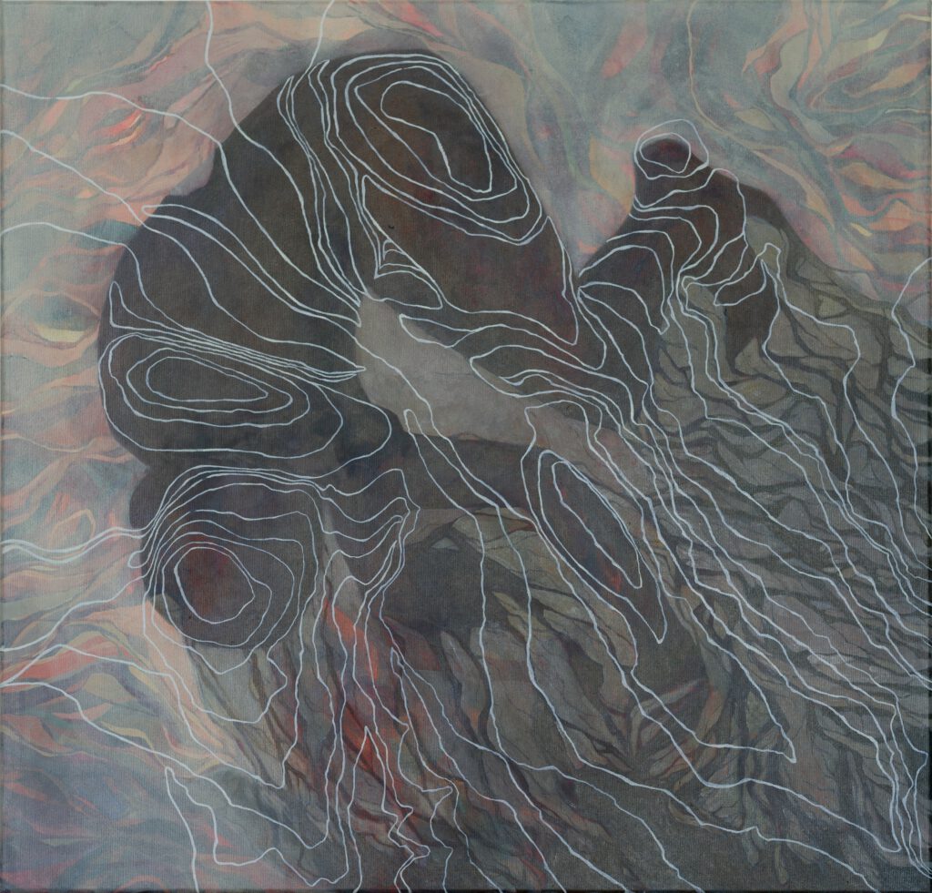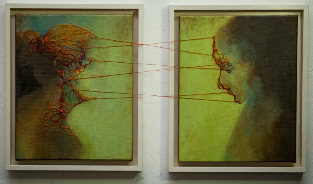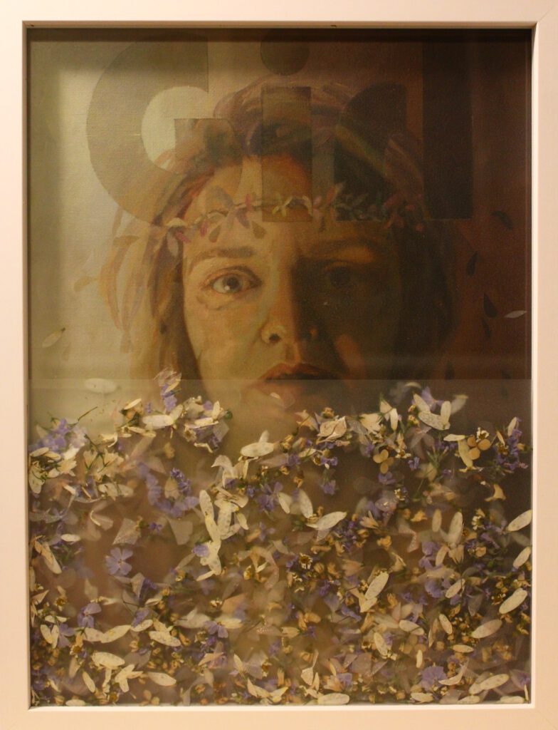 Paintings combined with various material. From left: dry flowers in glass frame, red thread stitched in canvas, wooden frame knitted into wool. 2013-2018